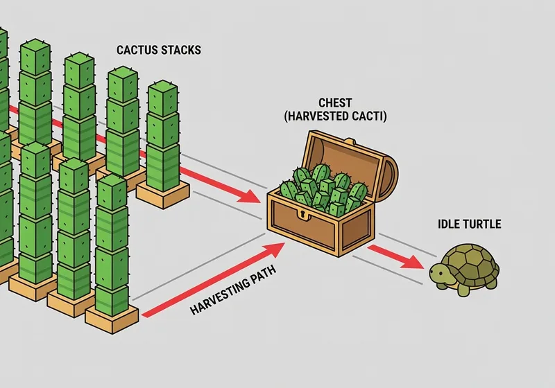 Ensure the turtle has inventory space for harvested cacti. Refer to the video for optimal layout and troubleshooting.