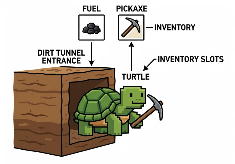 - Ensure you have a turtle with sufficient fuel and any required tools (e.g., for digging).