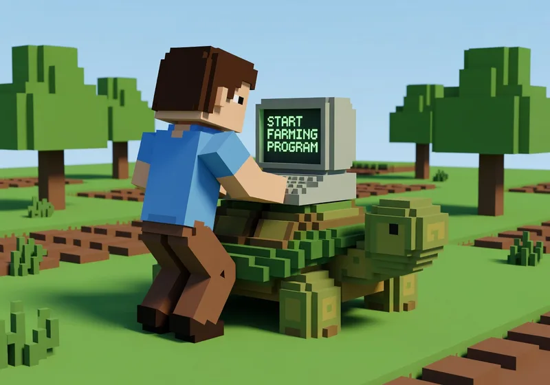 - Equip a turtle with fuel (e.g., coal) and any required tools or seeds based on the farm type shown in the video.